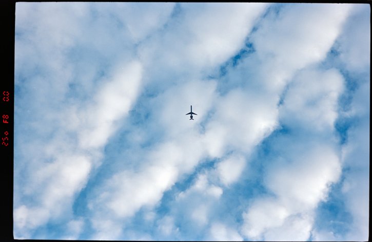 Jet passing by overhead with puffy clouds in the background. Kodak Ektar 100, Nikon F80s.