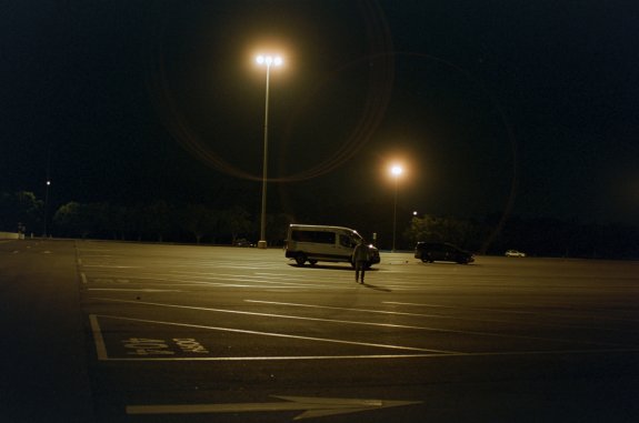 Empty parking lot at the end of the night. Shot at night on Kodak Vision3 250D movie film as still photography on the Nikon FM2n with the Voigtlander Ultron 40mm f/2 lens.