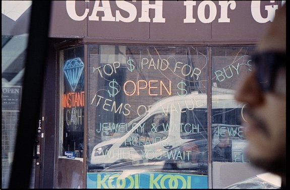 Neon sign cash for Gold store photographed with Kodak Portra 400 film.