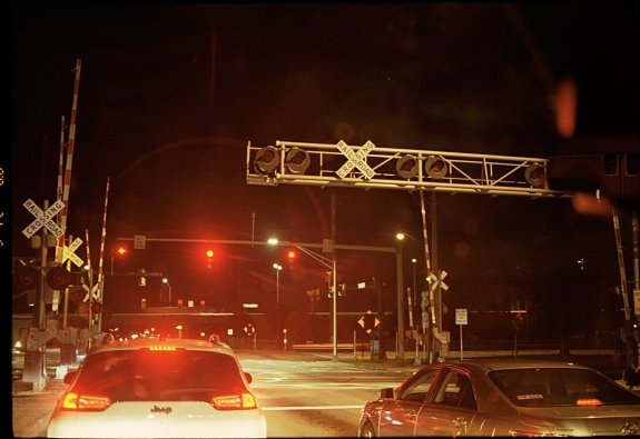 Stopped at a red light on train tracks at night. lomo CN 100 film.